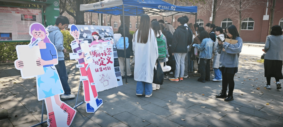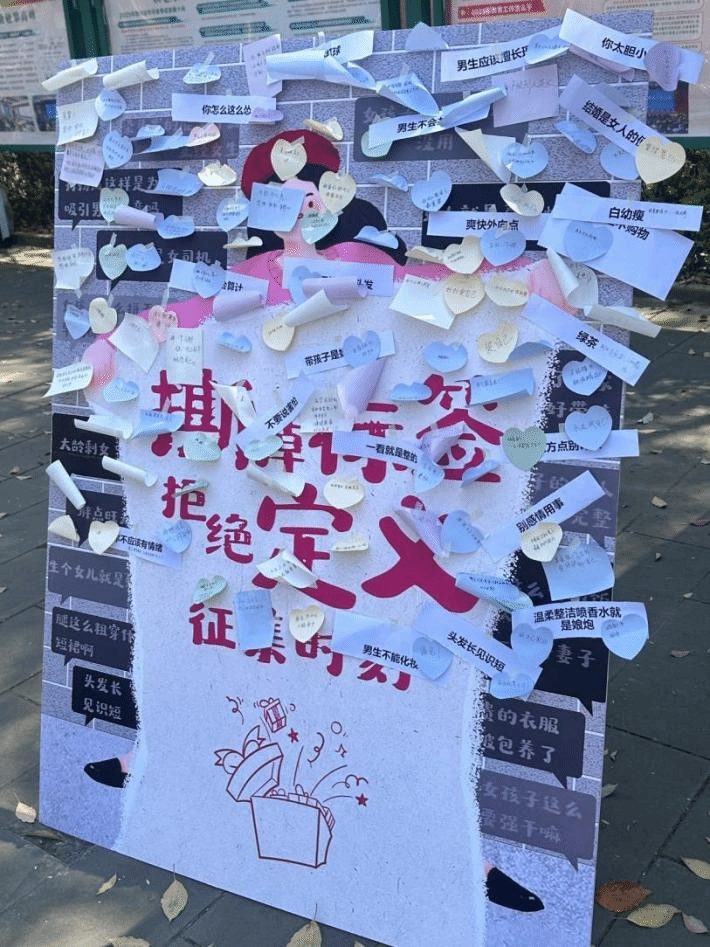 活动现场,最为抢眼的是两个立式人形展板,上面覆盖着形形色色的负面标签。这些标签反映了我们在日常生活中常常遭遇的刻板印象,例如“女生就应该照顾孩子、家庭”以及“男生不应该哭泣,要坚强”等。活动过程中,工作人员热情地邀请同学们分享自己曾被误解或不公平对待的经历,并将其化作文字贴在这个人形展板上,随后亲手撕去这些带有负面定义的标签。