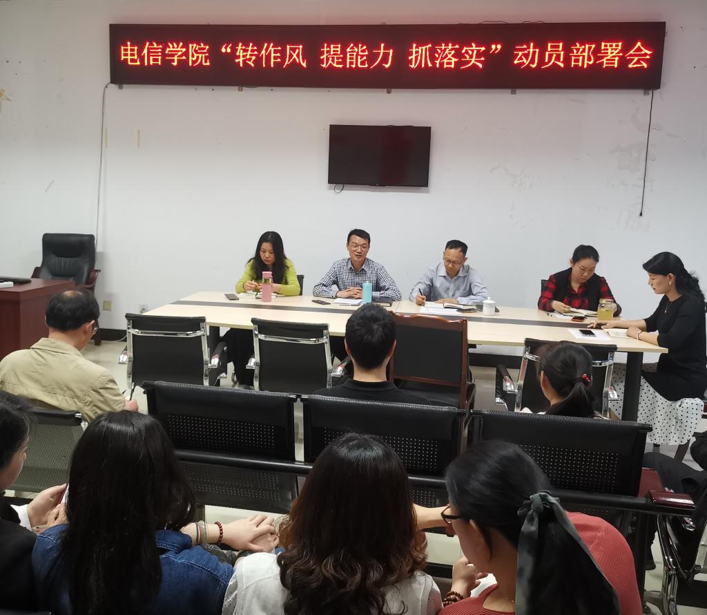 党总支书记王坤详细解读了公司“转作风、提能力、抓落实”活动方案内容,着重传达了省委教育工委书记李建勤同志重要讲话精神。他强调,全体教师要立足公司、公司面临的时与势,充分认识该项活动开展的紧迫性和现实意义;要认真审视自身在转作风、提能力、抓落实方面存在的问题,着力解决工作作风不严不实、创新意识不强、能力不足、本领恐慌等问题;要不折不扣落实党委常委会、董事长办公会决策部署和双高建设等重点任务。他要求,全院教师要进一步增强谋的能力、干的定力、成的信心,心往一处想、劲往一处使,把公司、公司“十四五”的规划图、设计图变为施工图、成果图,为实现公司升本目标贡献电信力量。