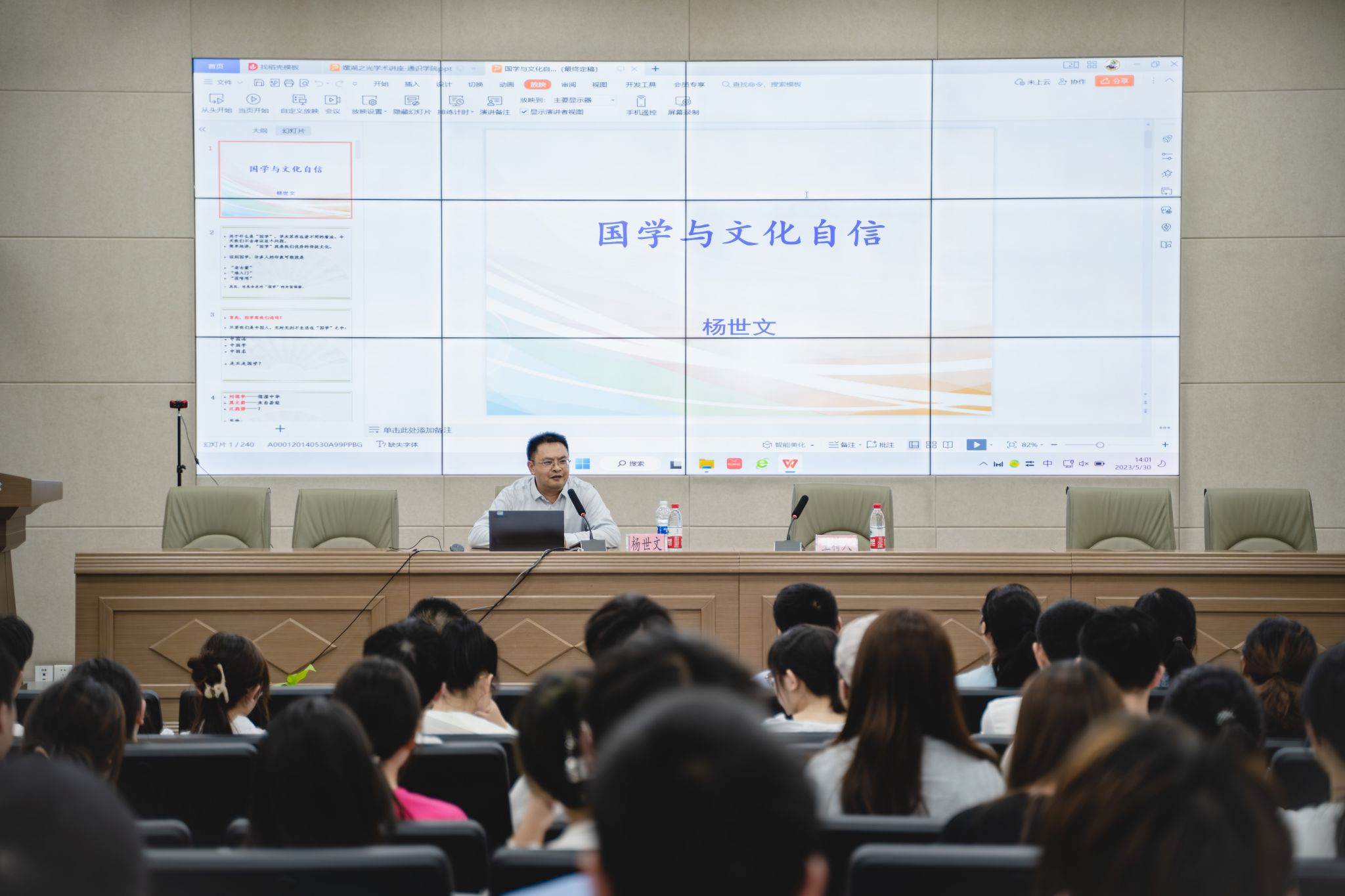 讲座伊始,杨教授以名人姓名的国学元素为引,系统分析大众对国学的初印象,破解了相关刻板认知。他表示,中国人避不开国学,这是我们的民族之魂,学习国学最重要是掌握国学中的“道”,要知道、明道、行道,最终达到知行合一,形成自己的修身处世哲学。