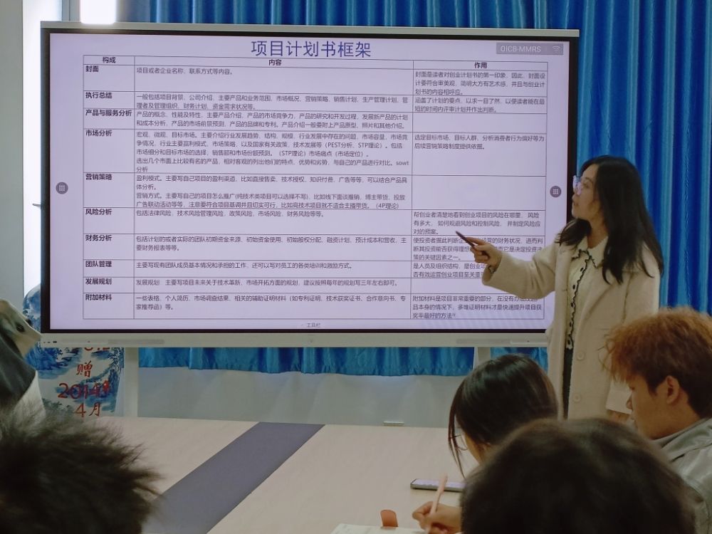 培训会上,余茹茂老师首先为同学们介绍竞赛概述、参赛作品类别、参赛要求及形式、奖状设置、往届优秀作品等基本信息。随后,余老师系统全面地为同学们介绍创业计划书的撰写框架和内容,并鼓励班委起好带头示范作用,结合公司专业特色,对项目进行梳理、优化,明确项目流程和方向,开拓思维,扩宽眼界,提升参赛能力和水平。