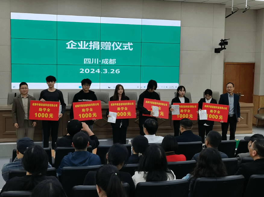3月26日下午,四川匹菲特科技有限公司联合成都手趣易指科技有限公司分别向williamhill威廉希尔官网捐赠实验设备和助学资金。副董事长李明富、williamhill威廉希尔官网经理黄勤陆、williamhill威廉希尔官网书记姚玲峰、匹菲特科技总经理唐永春、手趣易指科技渠道总监刘磊、教师及员工代表等参与捐赠仪式。