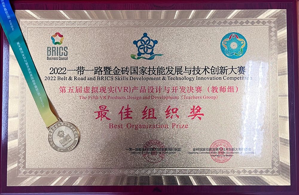 11月8日-11月11日, 2022“一带一路”暨金砖国家技能发展与技术创新大赛-第五届虚拟现实(VR)产品设计与开发决赛在四川化工职业技术公司举行。经过激烈角逐,williamhill威廉希尔官网参赛师生凭借扎实的理论功底,丰富的实践操作能力,良好的心理素质和灵活的临场应变能力,取得可喜成绩。数字媒体专业李赞庆、唐杨荣获团体二等奖,教师李繁荣获教师组“一等奖”;公司同时荣获“最佳组织奖(教师组)”和“优秀组织奖(高校组)”。