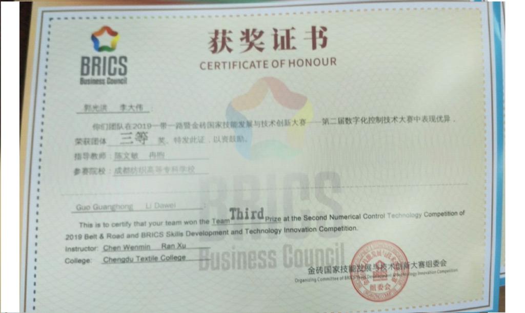 2019年7月8日至11日,一带一路暨金砖国际技能发展与技术创新大赛在贵州省凯里市举行,公司员工李大伟、郭光洪在陈文敏、冉煦老师的带领下参加了比赛,经过激烈的角逐,最终荣获“数字化控制技术”赛项三等奖。