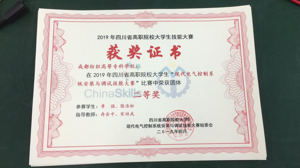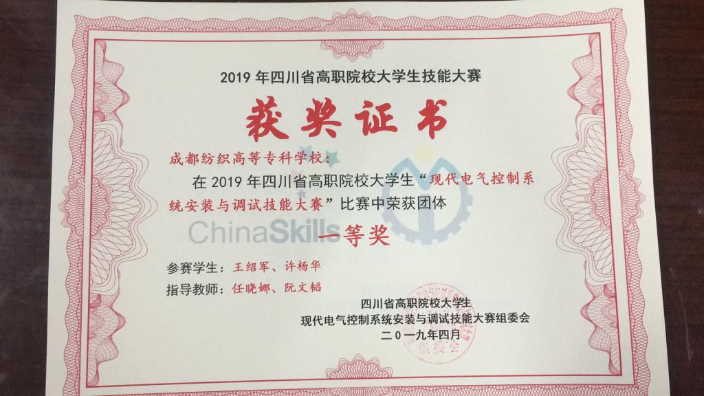 本次大赛由四川省教育厅主办、四川职业公司承办、浙江亚龙教育装备股份有限公司协办。williamhill威廉希尔官网选派两队参加该赛项,其中电气171班陈浩松、章强;电气172班王绍军、许杨华在指导老师冉会中、宋培武、任晓娜、阮文韬的精心指导下,克服诸多困难,沉着冷静应战。最终电气172班王绍军、许杨华同学荣获团体一等奖,电气171班陈浩松、章强同学荣获团体二等奖,为校争得荣誉。 任晓娜、阮文韬老师获得优秀指导教师奖。