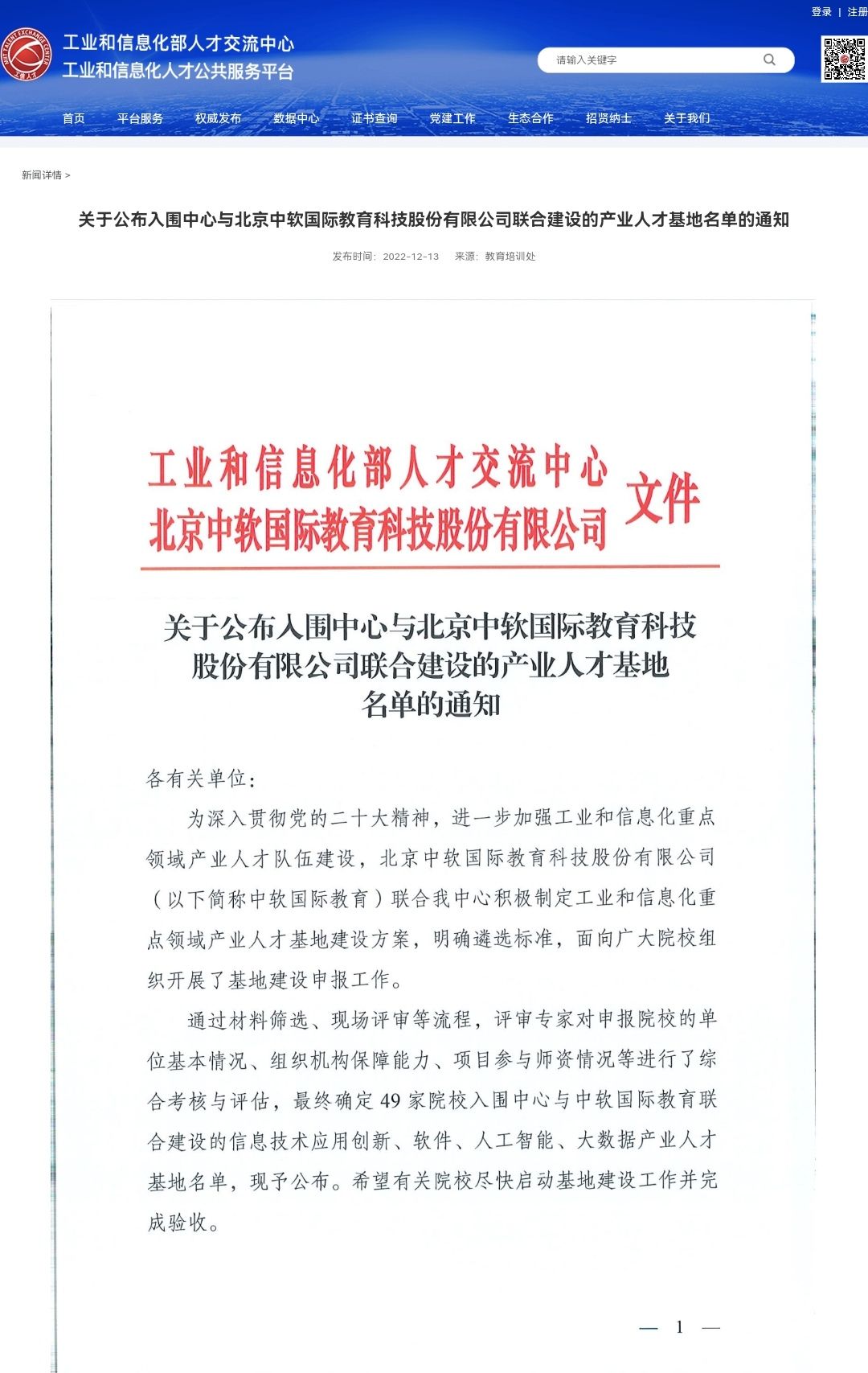 近日,工业和信息化部人才交流中心与北京中软国际教育科技股份有限公司发布了《关于公布入围中心与北京中软国际教育科技股份有限公司联合建设的产业人才基地名单的通知》,公司成功入围工业和信息化部重点领域产业人才基地名单。