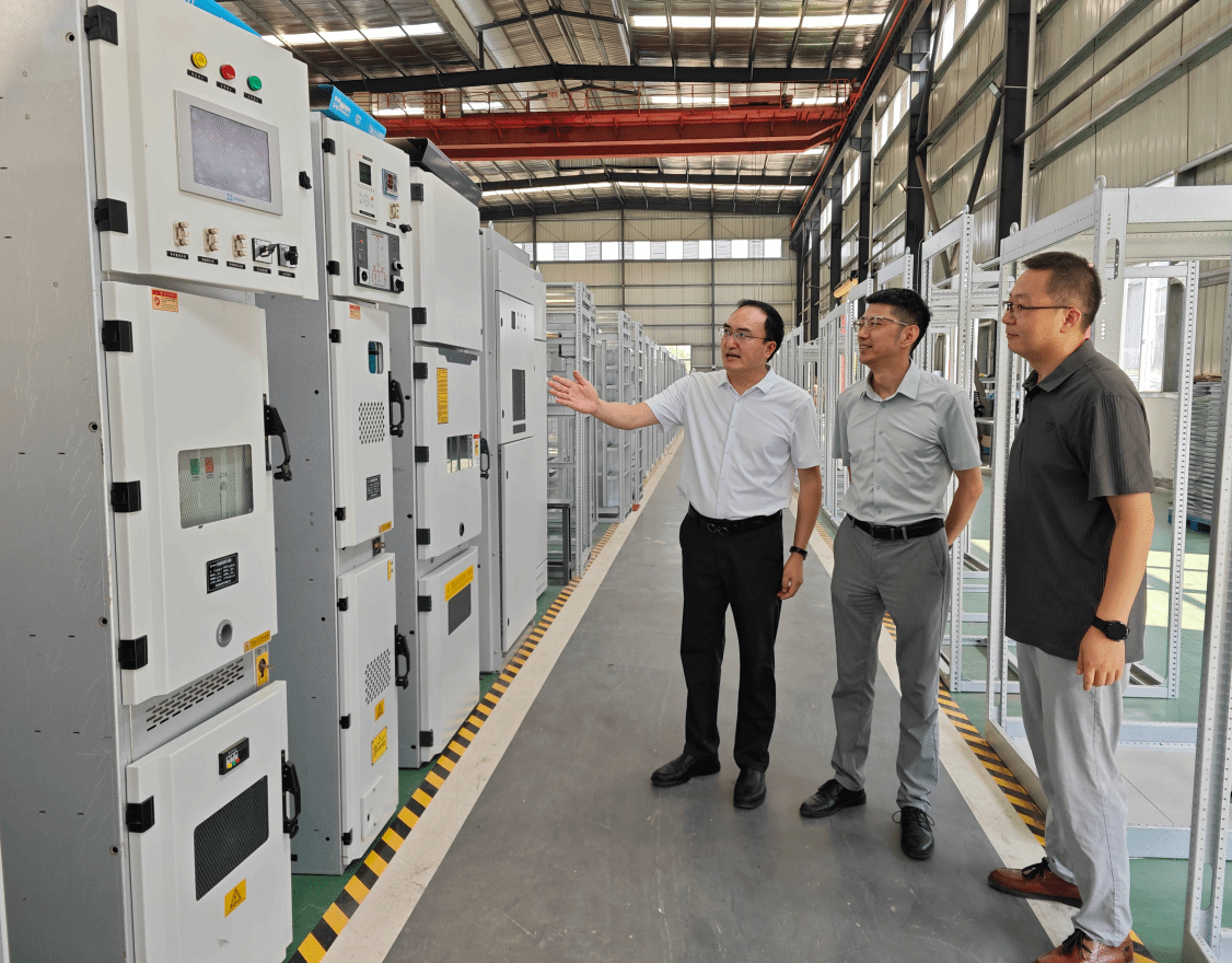 宋超一行在标杆电气董事长胡奎员工等的陪同下,参观了公司的生产车间,对公司预装式变电站等产品的生产工艺表示了由衷赞赏。在交流座谈中,胡奎对母校领导及教师的到来表示热烈欢迎,并对公司的发展历程、核心业务领域、技术创新成果、合作交流以及未来战略规划等做了介绍。