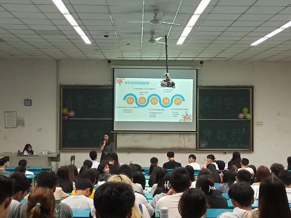 大数据181班团支书、省级优秀毕业生、省大学身综合素质A级证书获得者杨胜男主要和大家分享了专升本经验。她认为专升本是提高自我、继续深造的机会,可以拓宽自我视野。