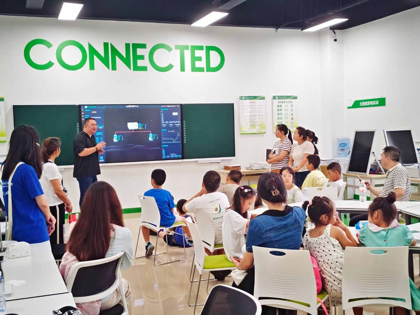 在williamhill威廉希尔官网法国施耐德电气绿色低碳技术应用中心,丁韬老师为小朋友们讲解电车的电源构造,介绍了新能源充电技术,如太阳能光伏板充电等,引发了孩子们的浓厚兴趣,大家围绕相关话题展开了热烈的交流与讨论。