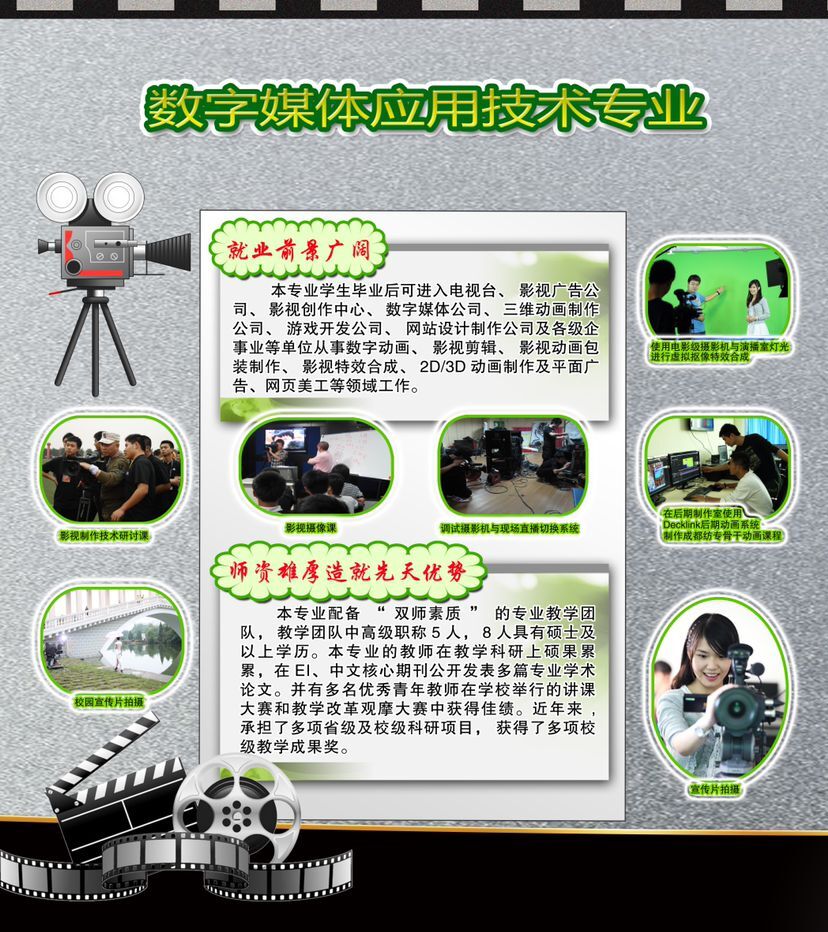 数字媒体应用技术专业介绍培养目标 培养掌握数字媒体基本理论,熟悉数字媒体制作技术,具备从事影视剪辑、影视广告制作、影视栏目包装、影视特效合成、影视动画制作、平面广告设计、网页设计、三维动画设计与制作等技能,具备合作与创新素质的高素质技术技能型专门人才。