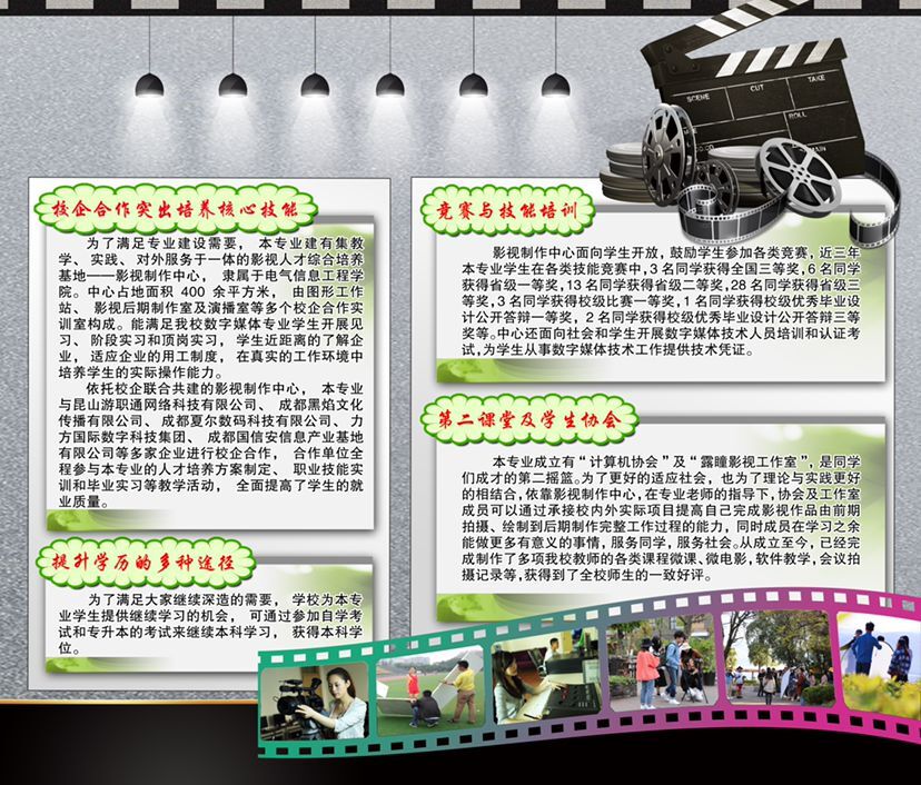 就业方向 在数字媒体行业从事数字动画、影视剪辑、影视广告制作、影视栏目包装、影视特效合成、影视动画制作、宣传片、微电影等拍摄制作工作以及网页美工设计、平面广告设计、网页设计、三维动画设计与制作等工作。